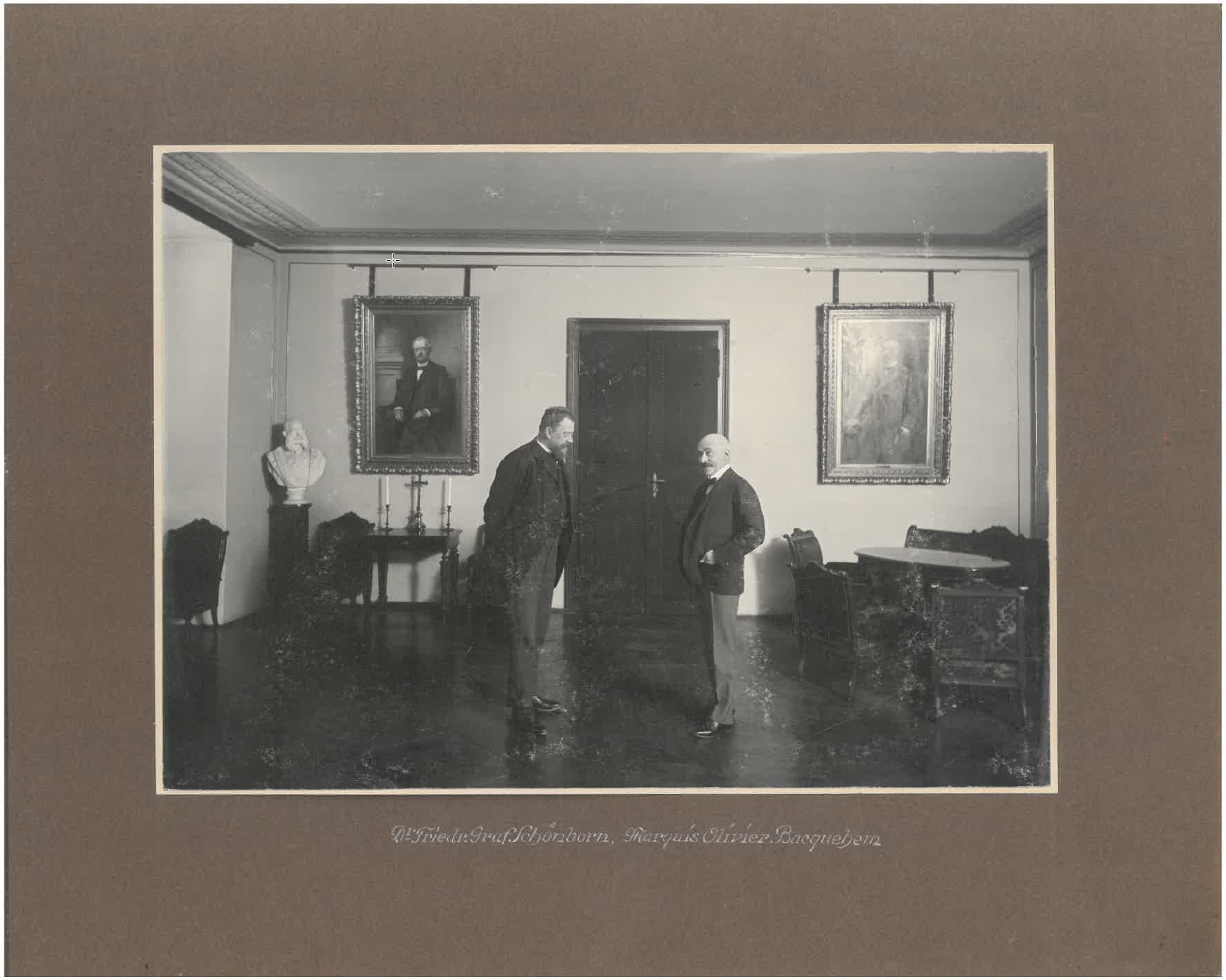 Diese Fotografie fand sich in einem alten Fotoalbum des Verwaltungsgerichtshofes. Sie ist etwa 1906/1907 im Palais Epstein entstanden. Sie sehen zwei (verschmitzt lächelnde?) Herren mittleren Alters, im Hintergrund zwei Ölgemälde und links im Bild eine Büste. Diese Fotografie erzählt aus den ersten 40 Jahren des Gerichtshofes.