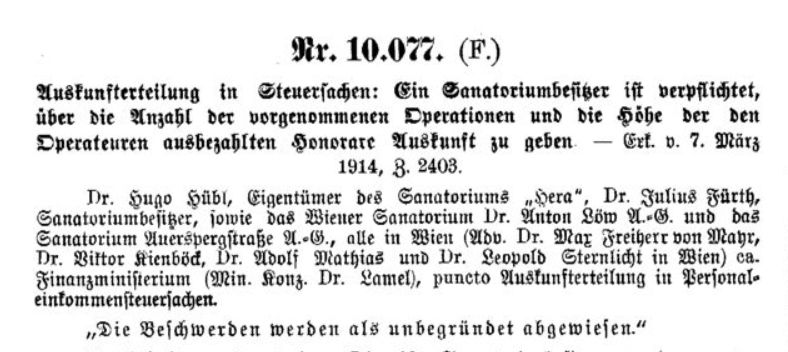 Am 8. März 1914 berichtete die Neue Freie Presse über eine Verhandlung des Verwaltungsgerichtshofes, die am Vortag stattgefunden hatte. Vier Sanatoriumsbesitzer hatten Beschwerde erhoben, weil sie nicht bereit waren, der Steuerbehörde Auskunft über die Zahl der Operationen und die Honorare der operierenden Ärzte zu geben. Der Verwaltungsgerichtshof wies in seinem mündlich verkündeten Erkenntnis (Budw. Nr. 10.077 [F]) die Beschwerden ab. Die prinzipielle Verpflichtung zur Auskunftserteilung, die ihre gesetzliche Grundlage in § 269 des Gesetzes über die directen Personalsteuern hatte, stand für den VwGH nicht in Zweifel, und auch die Argumente der Sanatoriumsbesitzer, sie würden dadurch eine anerkannte Pflicht zur Verschwiegenheit oder ein „Kunst- oder Gewerbegeheimnis“ verletzen, überzeugten den Gerichtshof nicht.